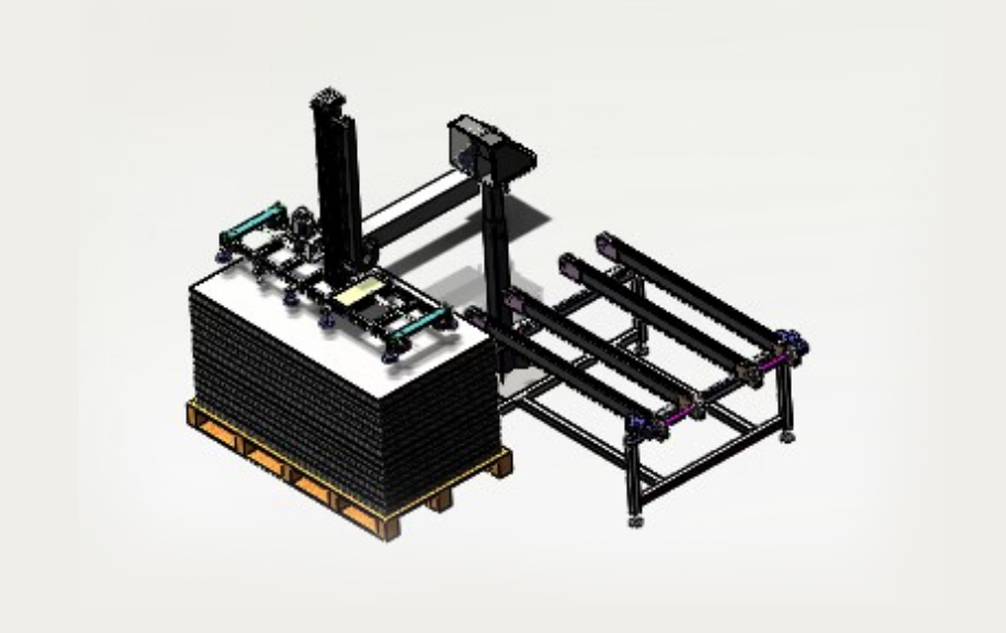 自動排版機的主要功能單元有:玻璃輸送定位系統(tǒng)、抓取行走系統(tǒng)、視覺檢測系統(tǒng)、電控系統(tǒng)等;通過以上功能單元,實現了將自動串焊機串焊好的電池串,按照工藝尺寸要求和排版方向順序自動排版鋪設到玻璃(EVA已經鋪設)上,組成電池串陣列。玻璃/EVA通過傳輸線傳輸至指定位置,機械手抓取電池串實現CCD定位、自動旋轉、自動排版功能。設備通過同步帶傳輸與自動生產線對接,實現了自動流水作業(yè)。